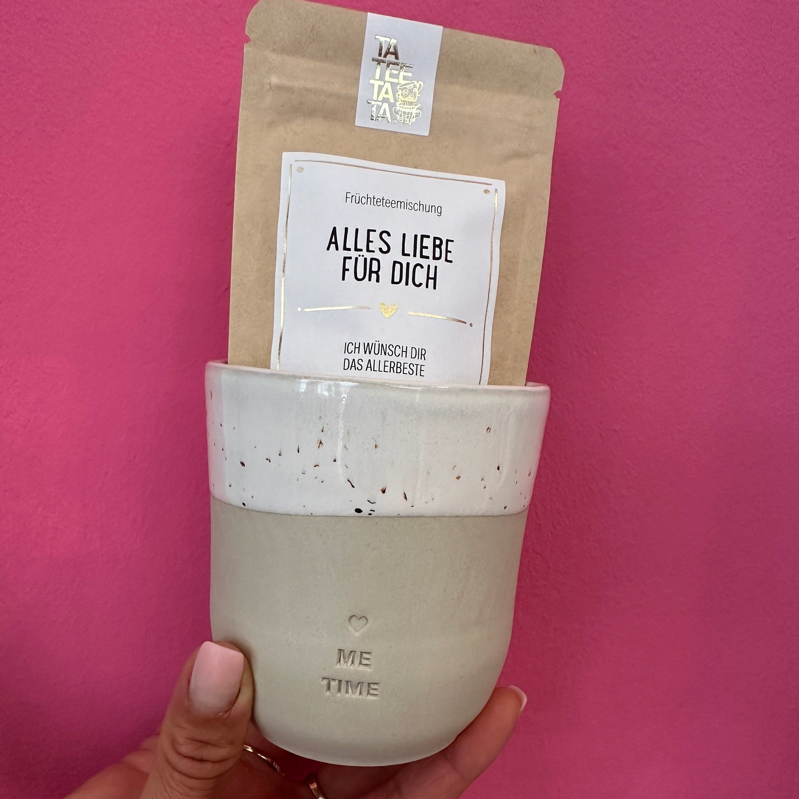 Mit diesem wunderschönen, handgefertigten Becher aus Portugal wird die Auszeit gleich doppelter Genuss. Jeder Becher ist einzigartig und ein Unikat. Die natürlichen Farbnuancen gepaart mit dem minimalistischem Design und die Blindprägung "Me time" harmonieren perfekt.