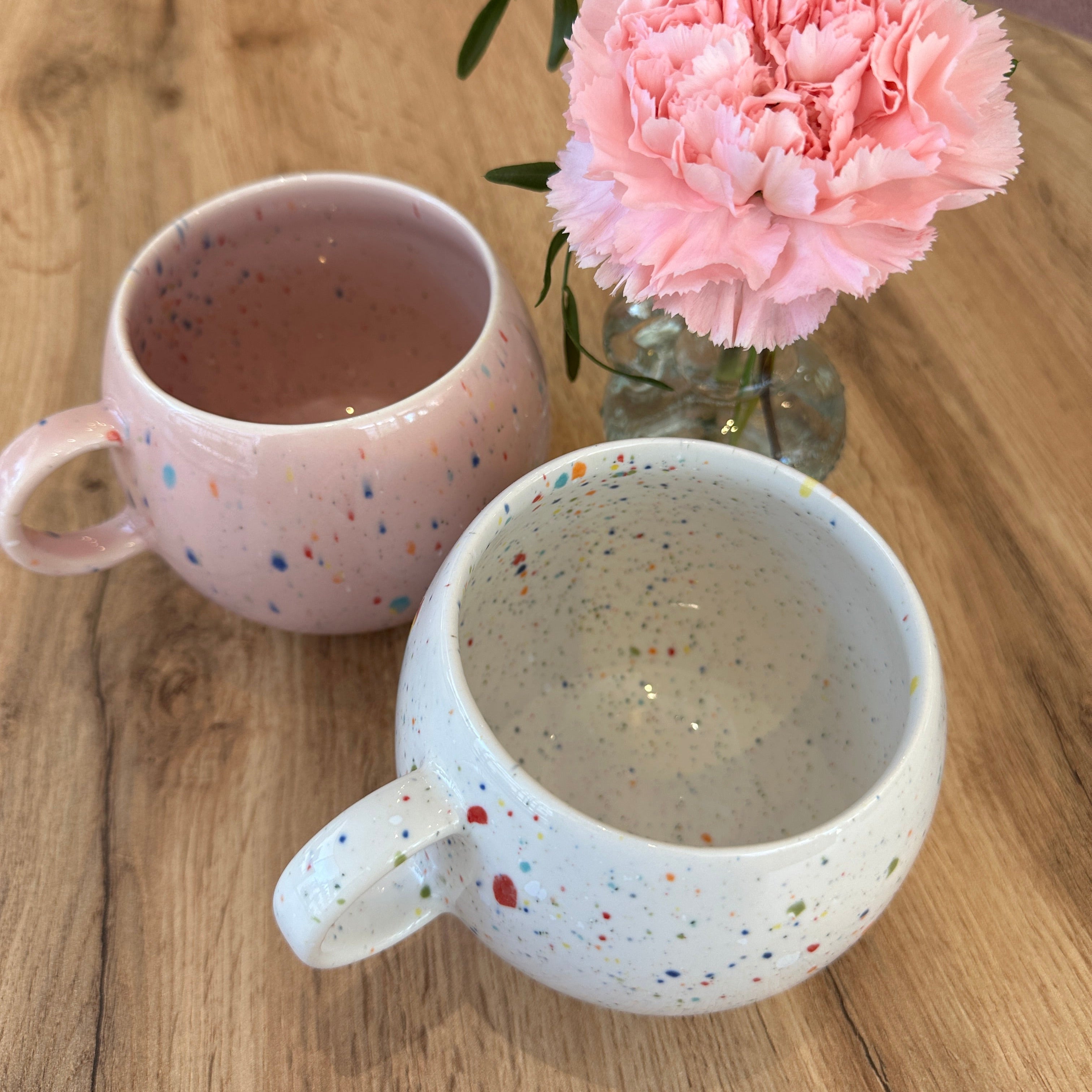 Diese handgefertigte Keramiktasse bringt Farbe in deinen Alltag! Der zarte roséfarbene Grundton kombiniert mit fröhlich-bunten Sprenkeln in Blau, Rot, Orange, Grün und Gelb erinnert an Konfetti – perfekt für alle, die das Leben feiern wollen, selbst beim ersten Kaffee am Morgen.