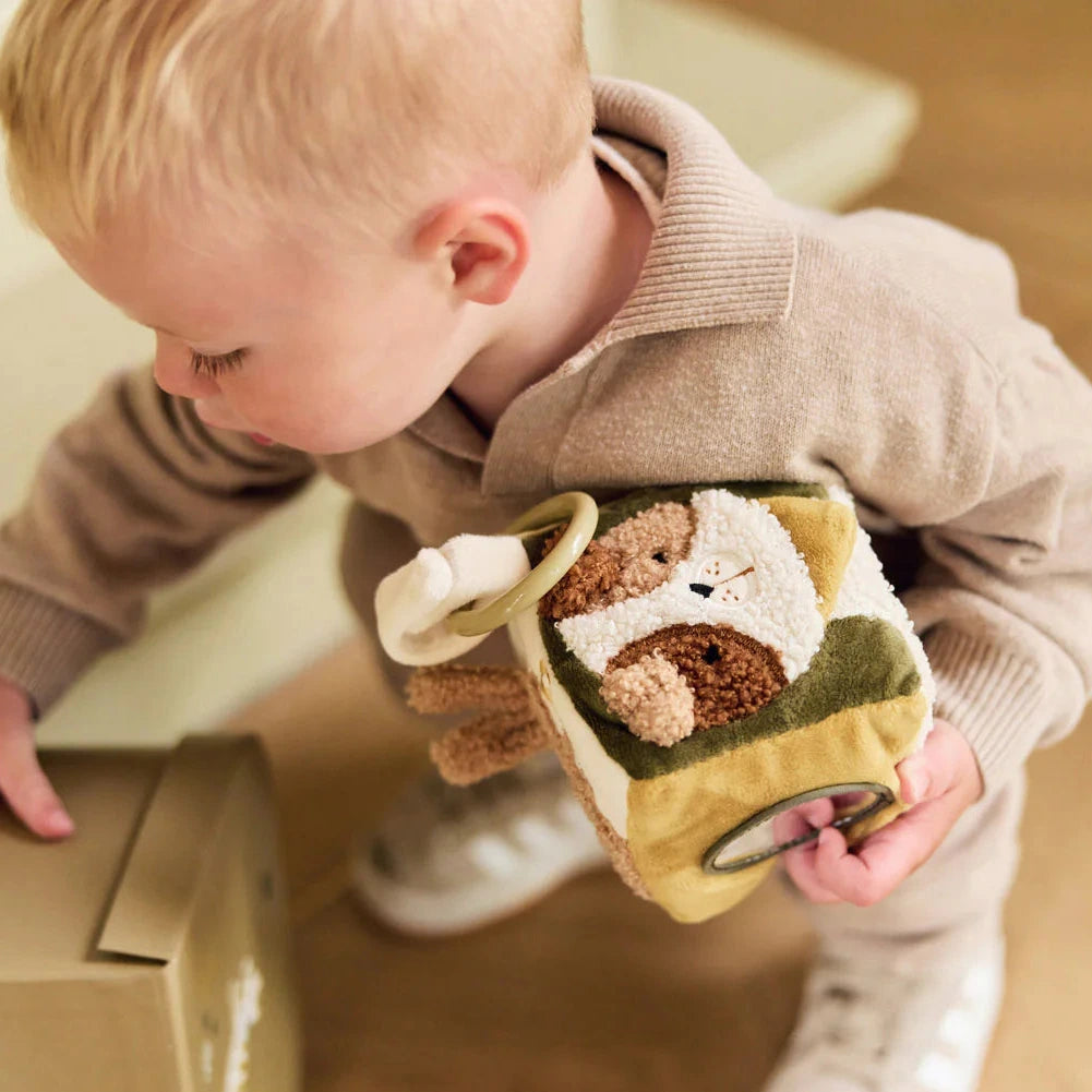 Dieser weiche Aktivitätenwürfel ist ein zauberhaftes Spielzeug für Babies und Kleinkinder bis ca. 18 Monaten. Mit niedlichen Tieren wie einer Katze, einem Hund und einer Eule sowie interaktiven Elementen wie knisternden Ohren und einem Spiegel regt er die Sinne und die motorische Entwicklung deines Babys an. Ein fröhlicher und lehrreicher Würfel – perfekt für langen Spielspaß im Laufstall oder unterwegs!