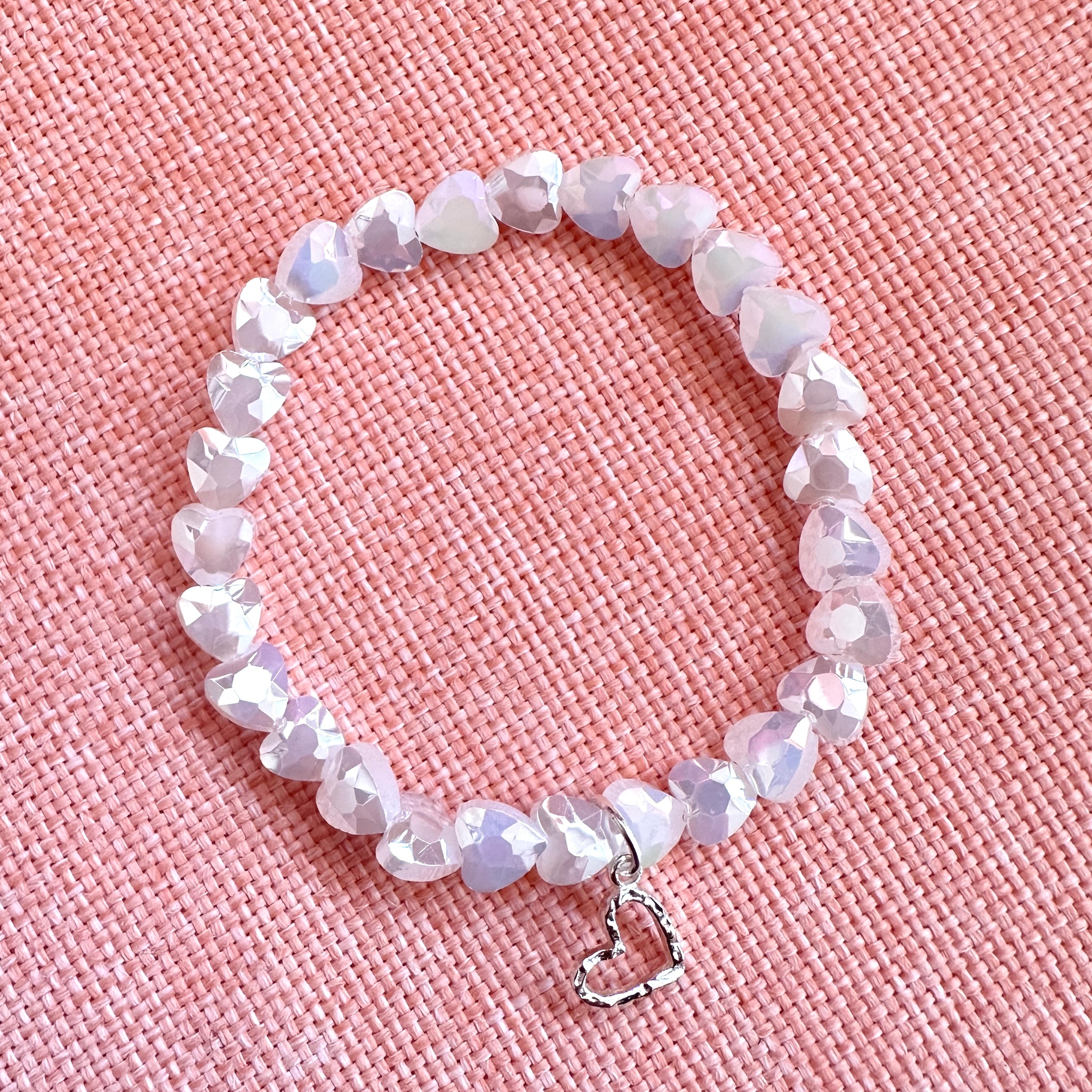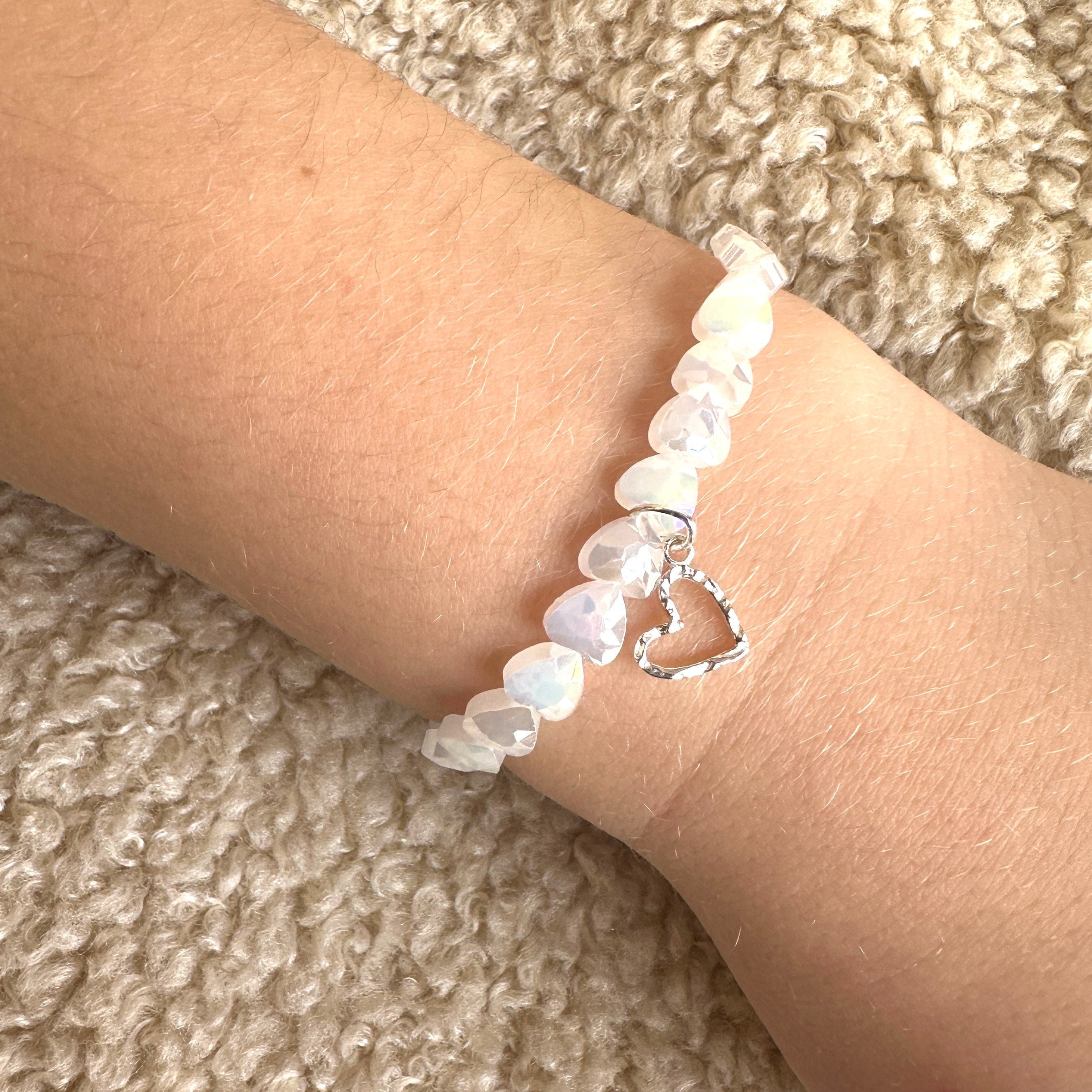 Weiße Herzen: Da die Herzchen facettiert sind, haben sie einen tollen Effekt am Armgelenk. Mittig befindet sich ein geschwungenes Herz aus hochwertigem 925 Sterlingsilber.
