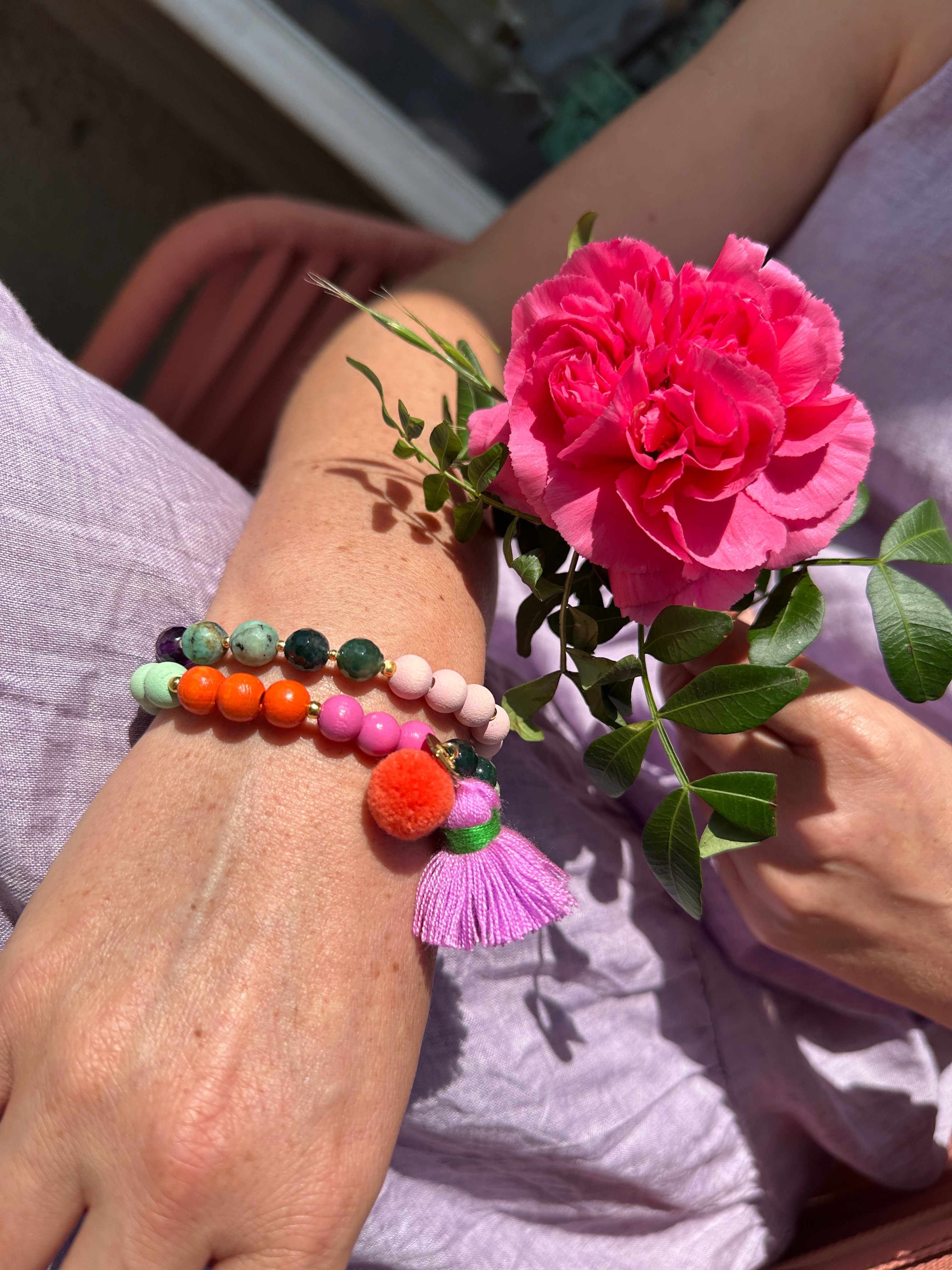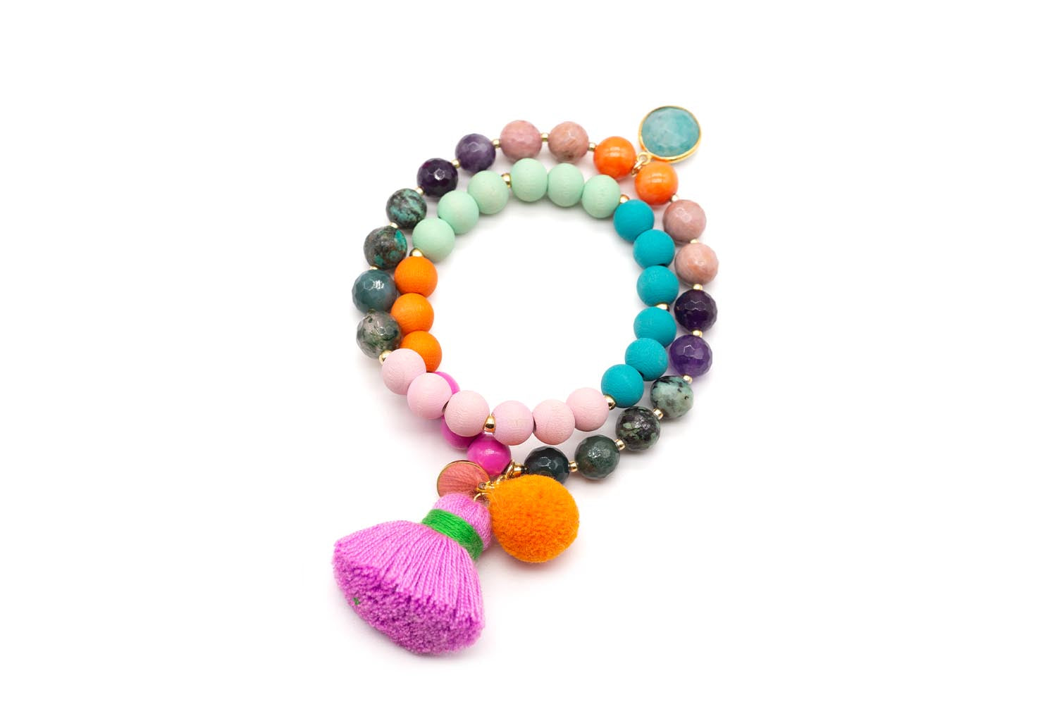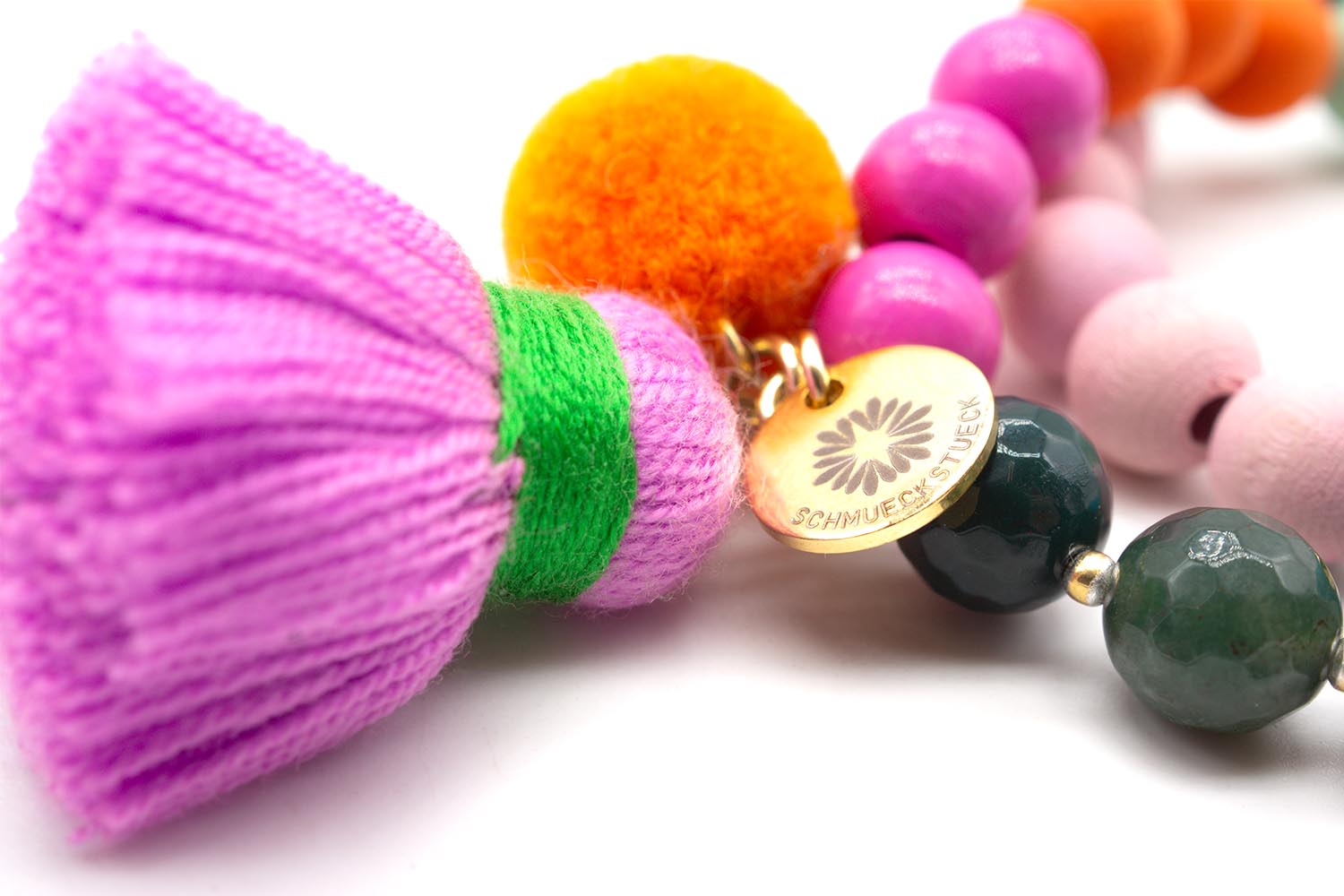 Ein ganz besonderes Armband mit vielen Details. Dieses wunderschöne Armband aus Holzperlen ist doppelt auf Elastikband aufgezogen und teilweise aus Sterlingsilber vergoldet. Als spezielle Hingucker wurden zusätzlich diverse Edelsteine, ein Amazonit-Anhänger sowie Quasten und Pompons verarbeitet.
