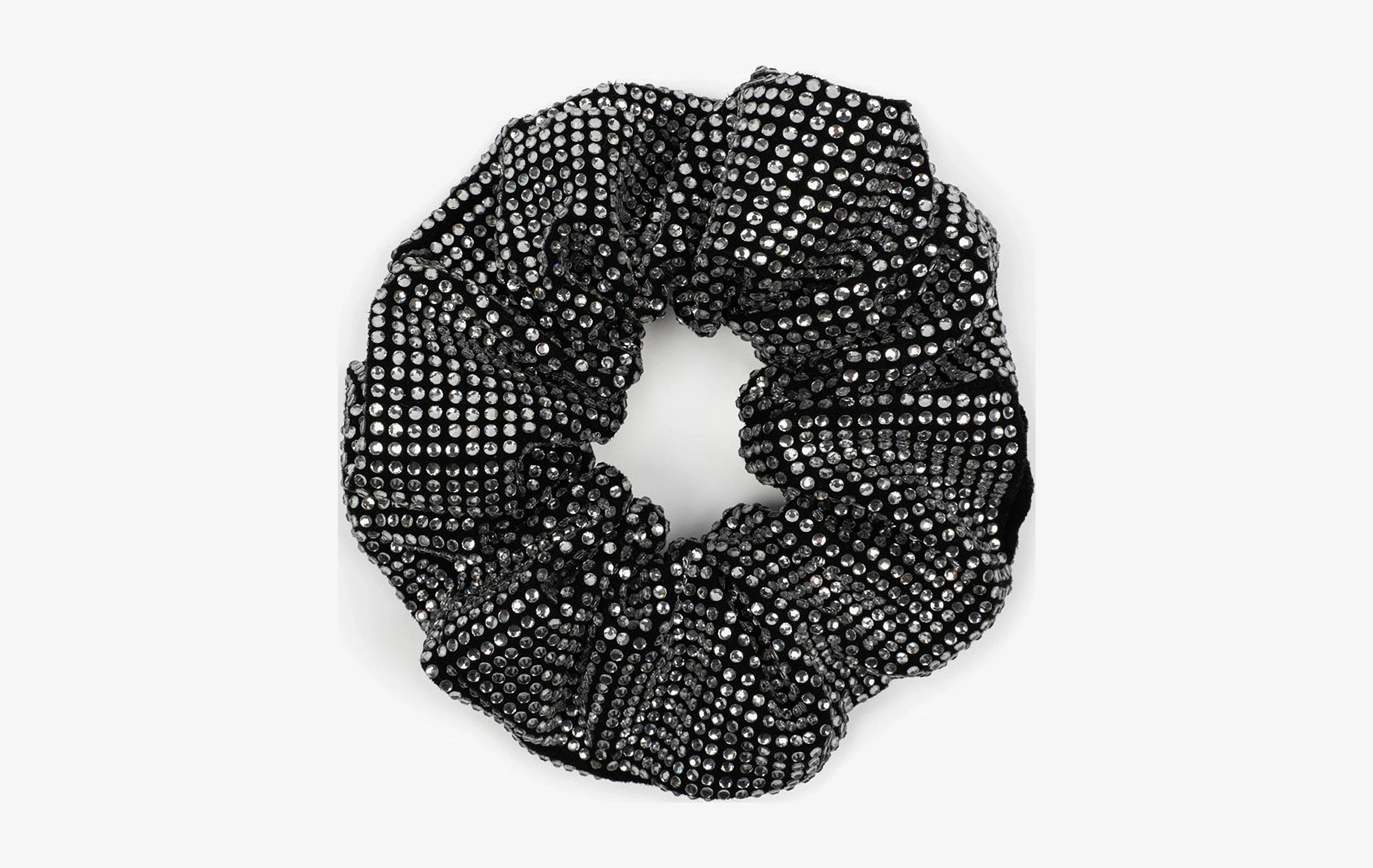 Mit diesem glamourösen Scrunchie bringst du Glanz in jeden Look! Der Haargummi besteht aus schwarzem Stoff, der rundum mit funkelnden silbernen Strasssteinen besetzt ist – perfekt für besondere Anlässe, Partys oder einfach, um deinem Alltagsoutfit ein elegantes Highlight zu verleihen.