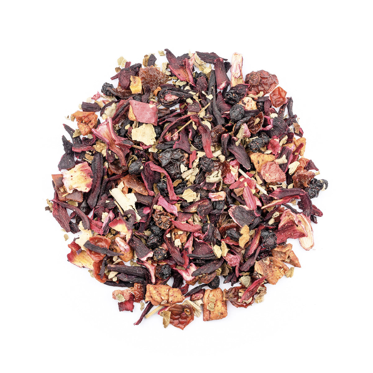 Hibiskusblüten, Hagebuttenschalen, Apfelstücke, Fliederbeeren, Brombeerblätter, Aroma, gefr.-getr. ganze Brombeeren, gefr.-getr. Erdbeerstücke, gefr.-getr. Himbeerstücke.